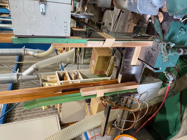 厚さ3,5,7.5㎜の無垢材を巾5,10㎜に自動引き割をしていました。