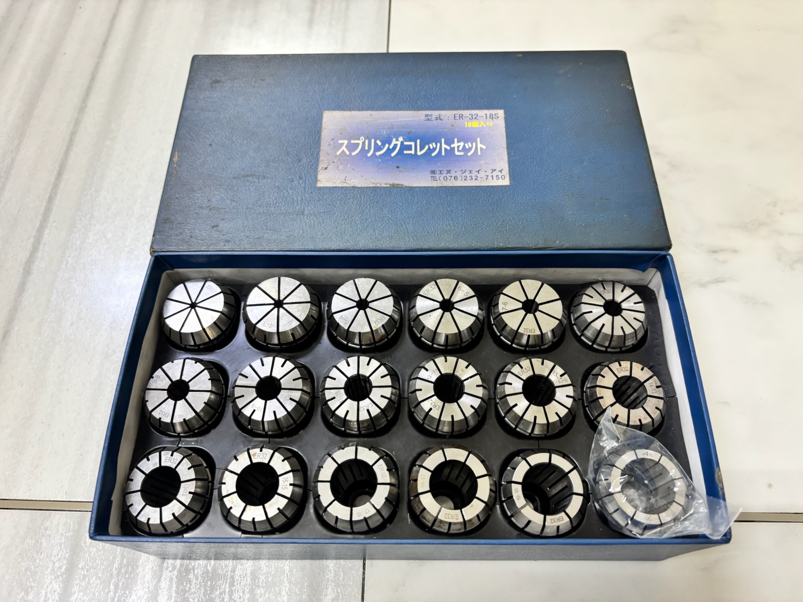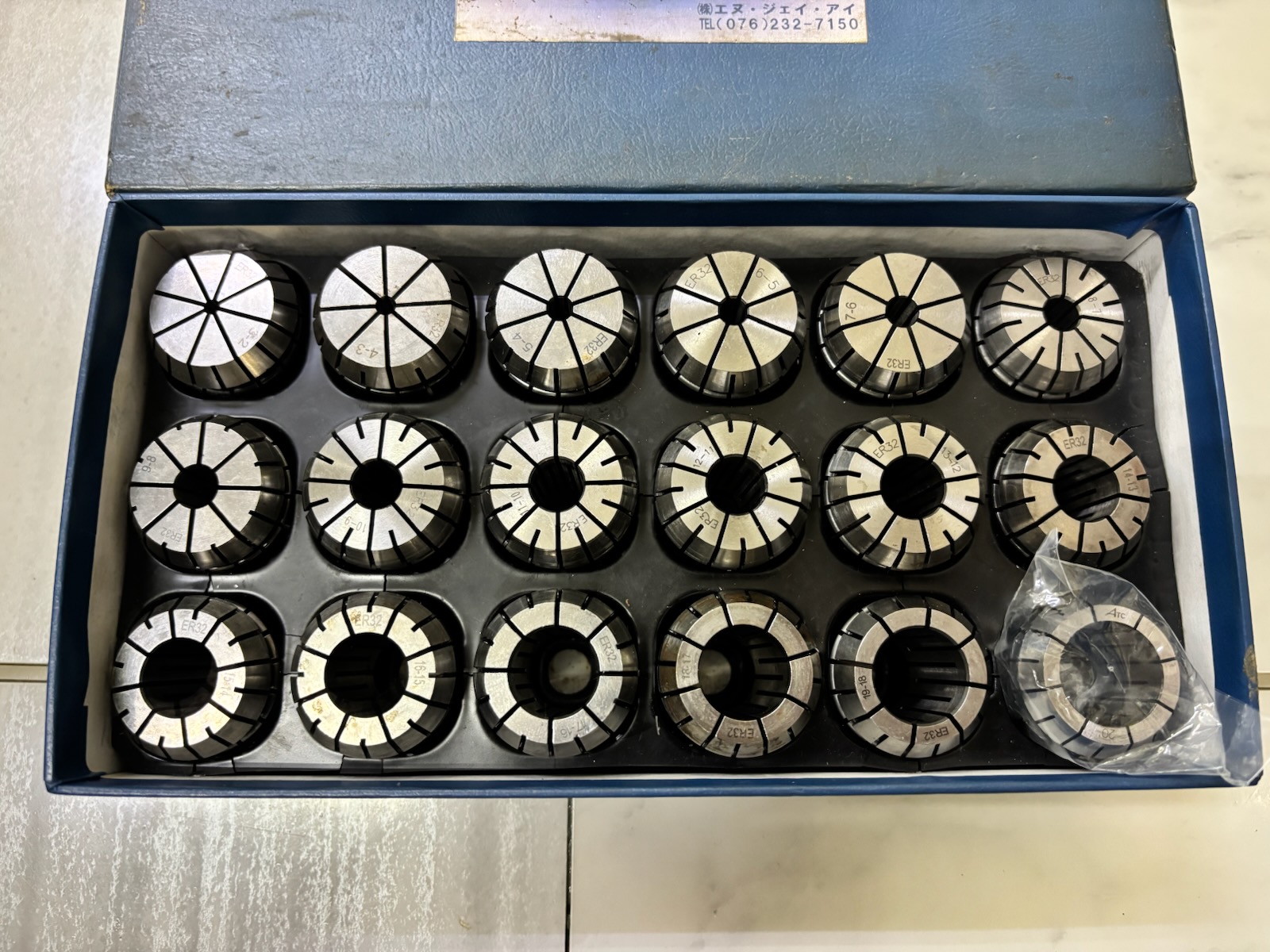 一番右下の19-20のコレットのみ欠品していたため、別メーカー(アルプスツール)の新品で補充してあります。