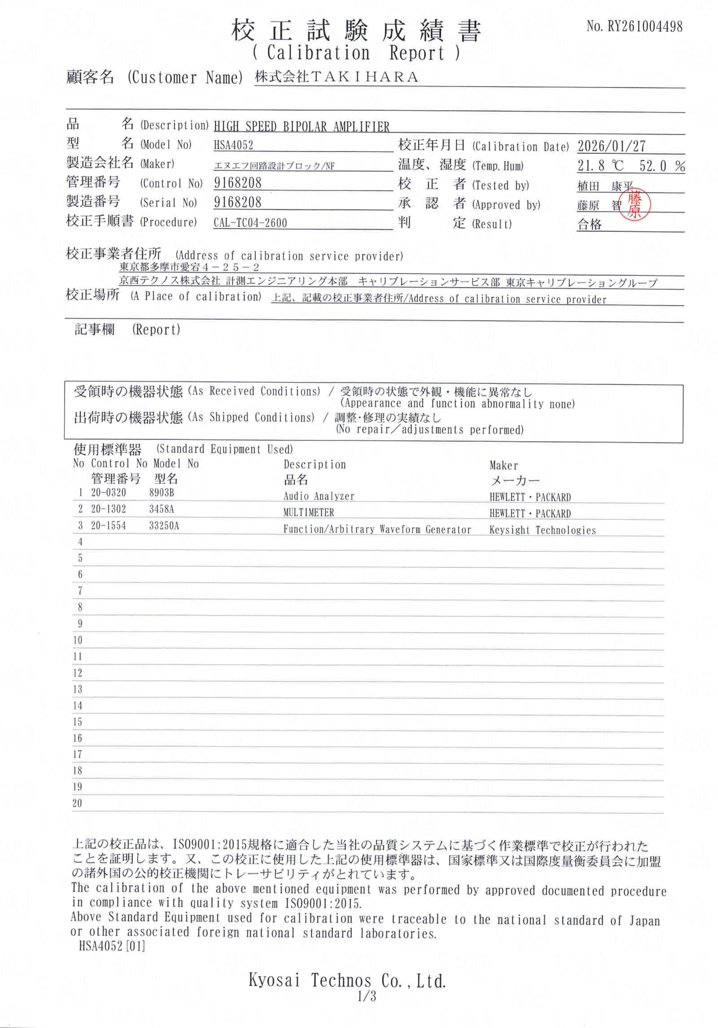 ◇ 付属品:校正試験成績書/電源ケーブル