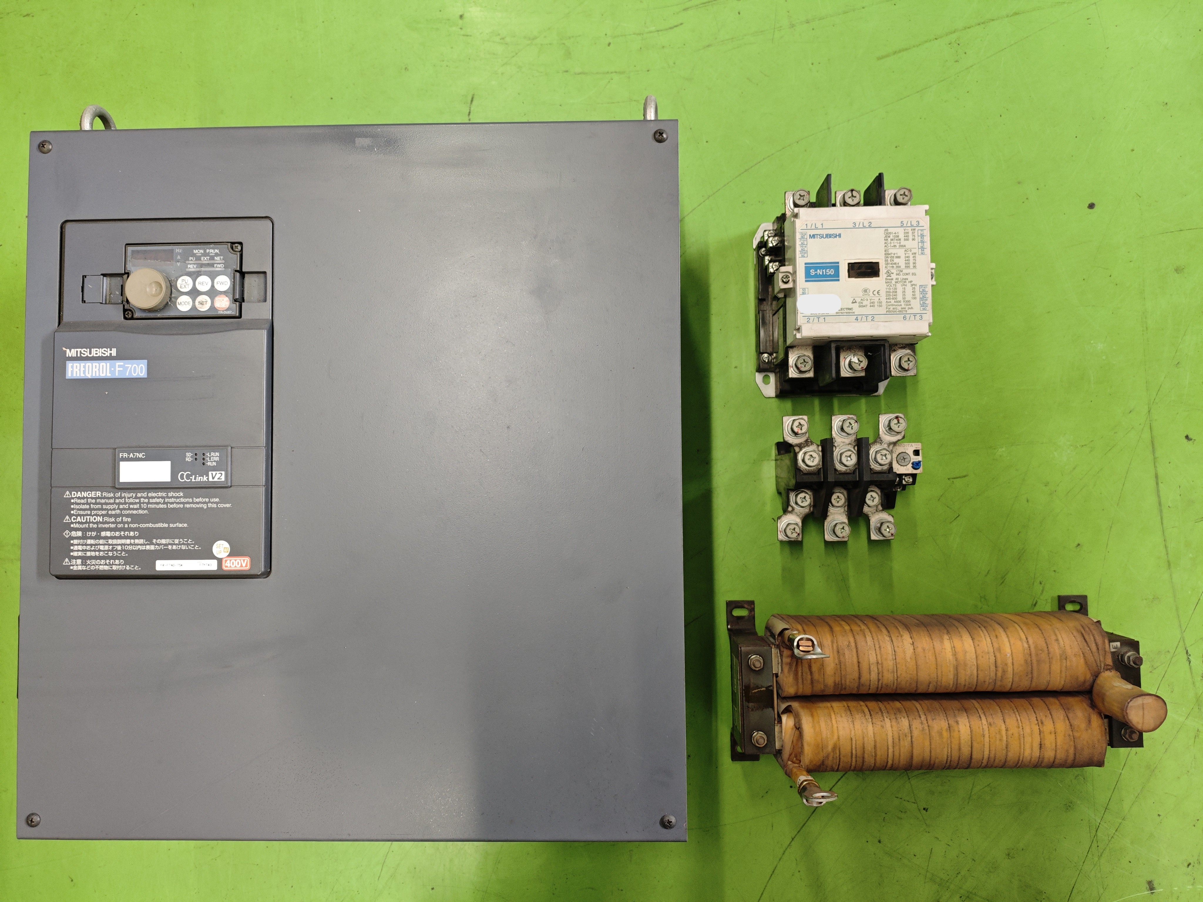 三相400V 75kWモーター用のインバータとマグネット、サーマル、DCリアクトルのセットです。
