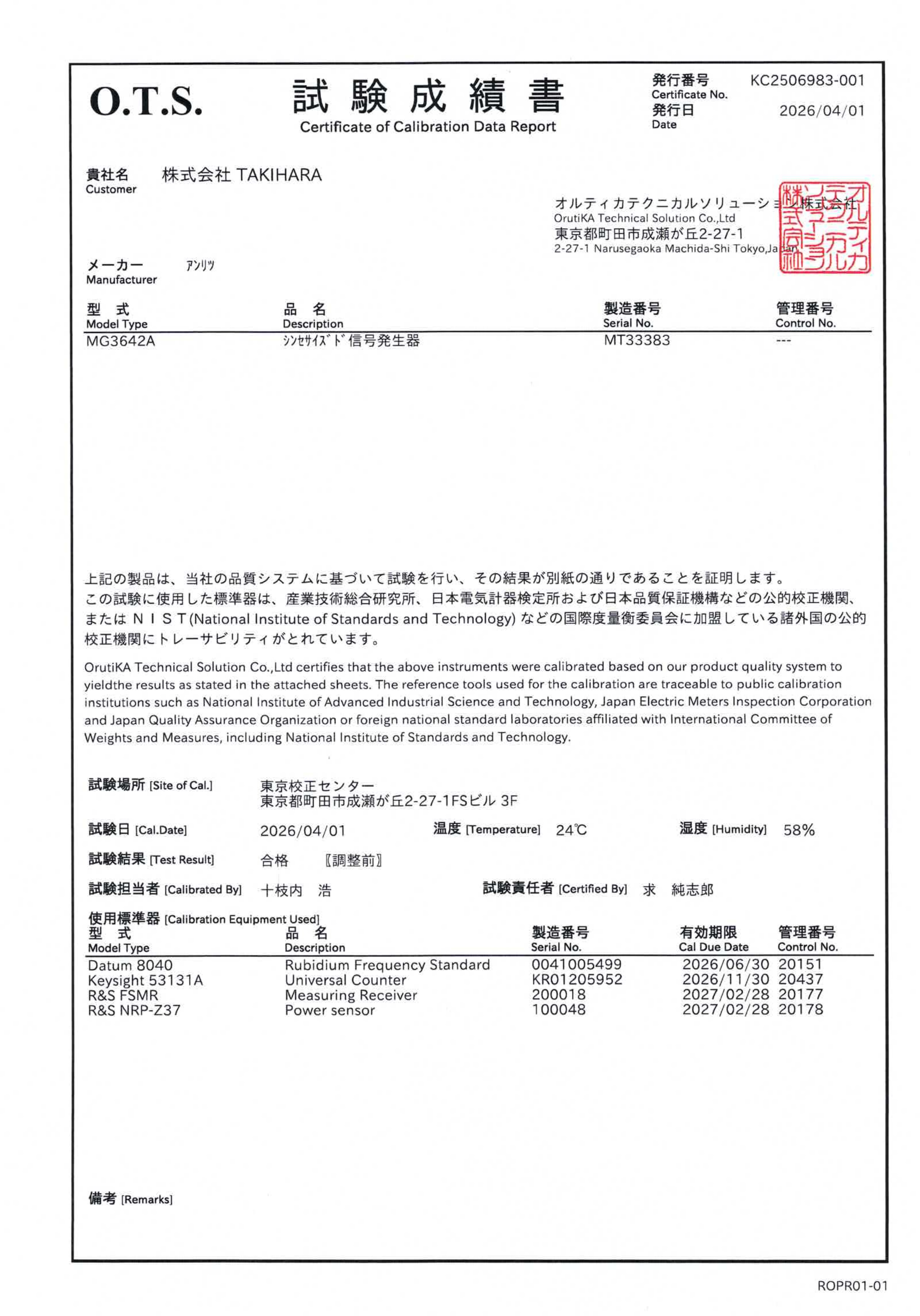 校正試験成績書付きです。